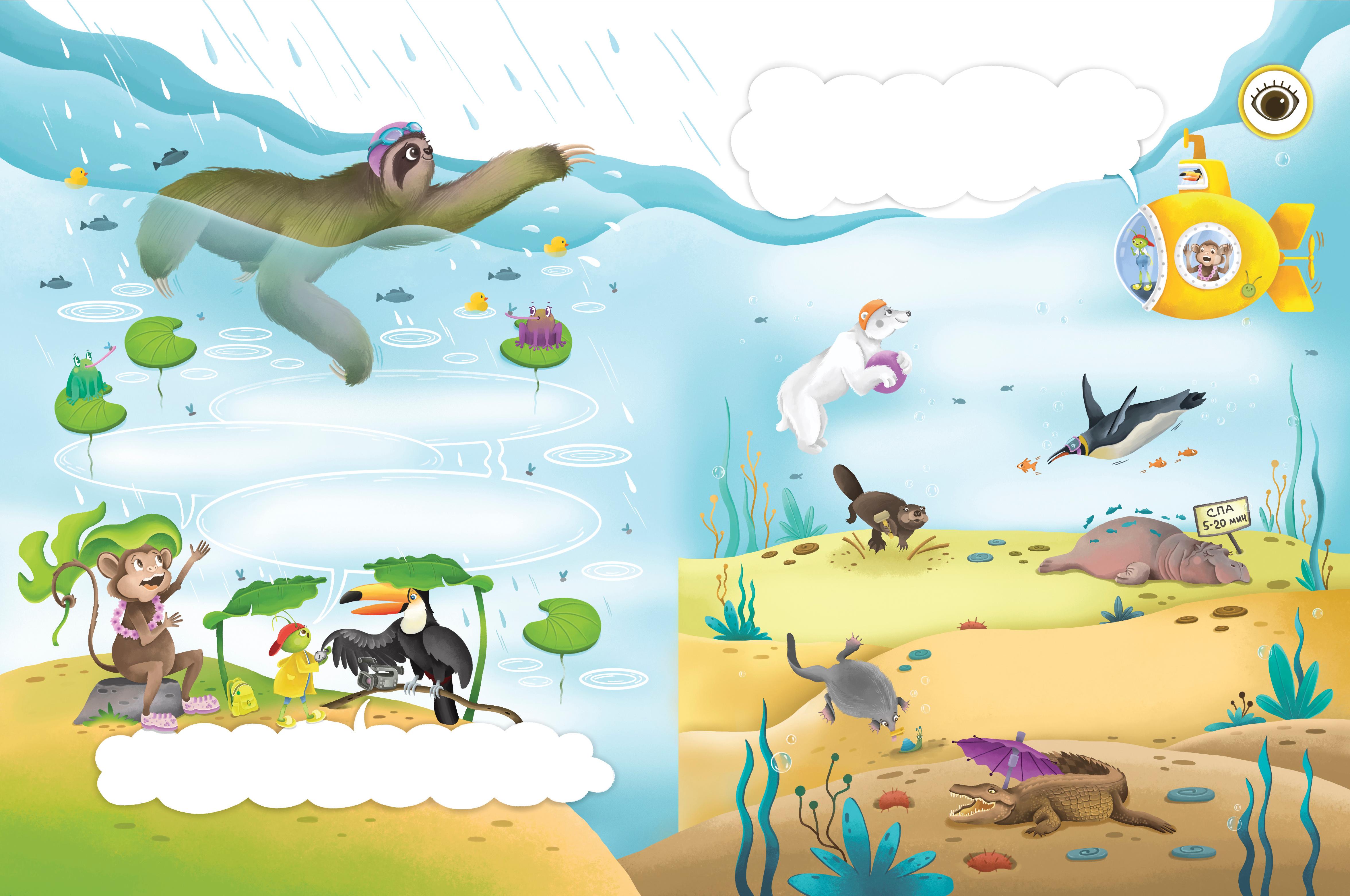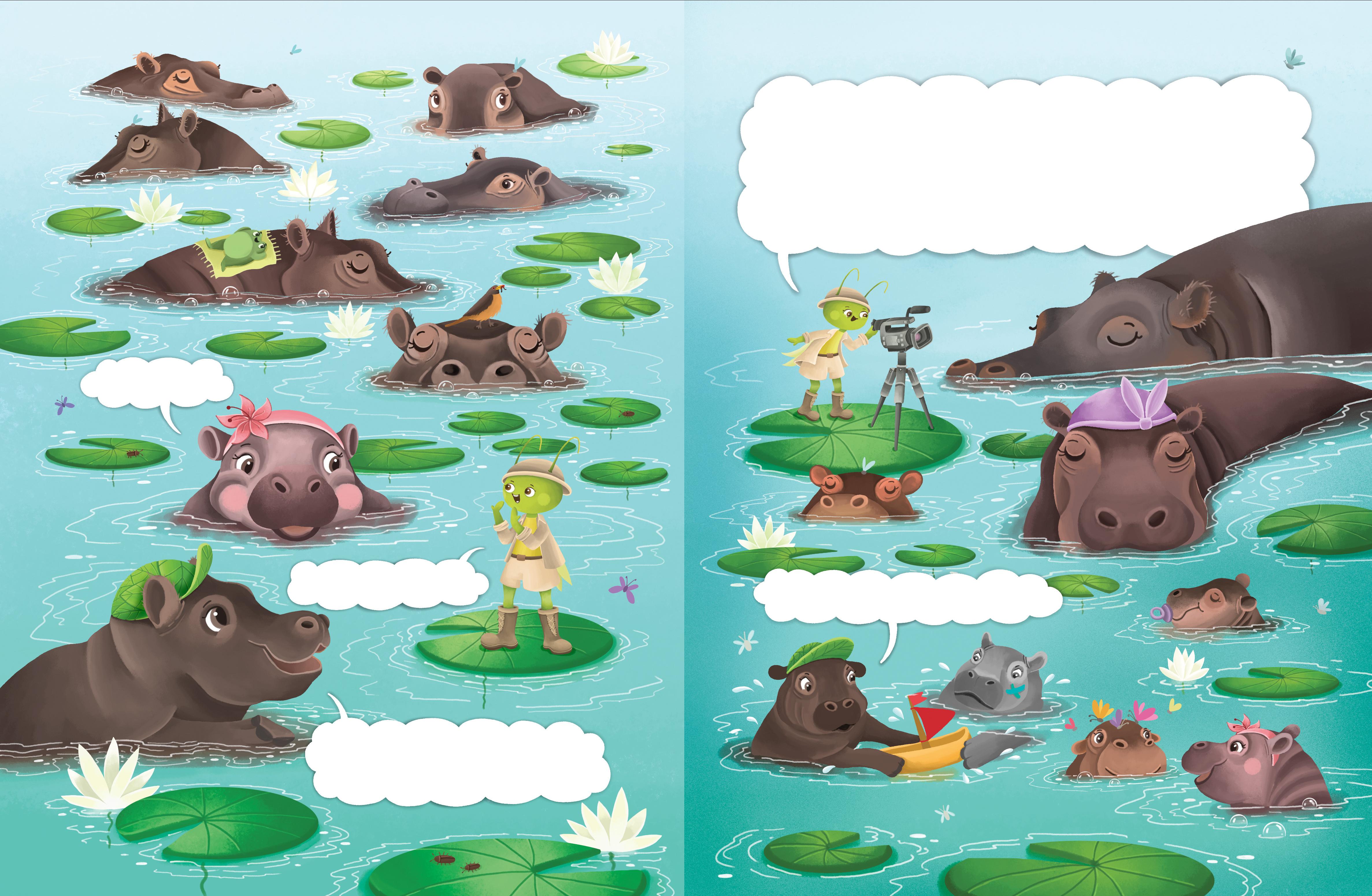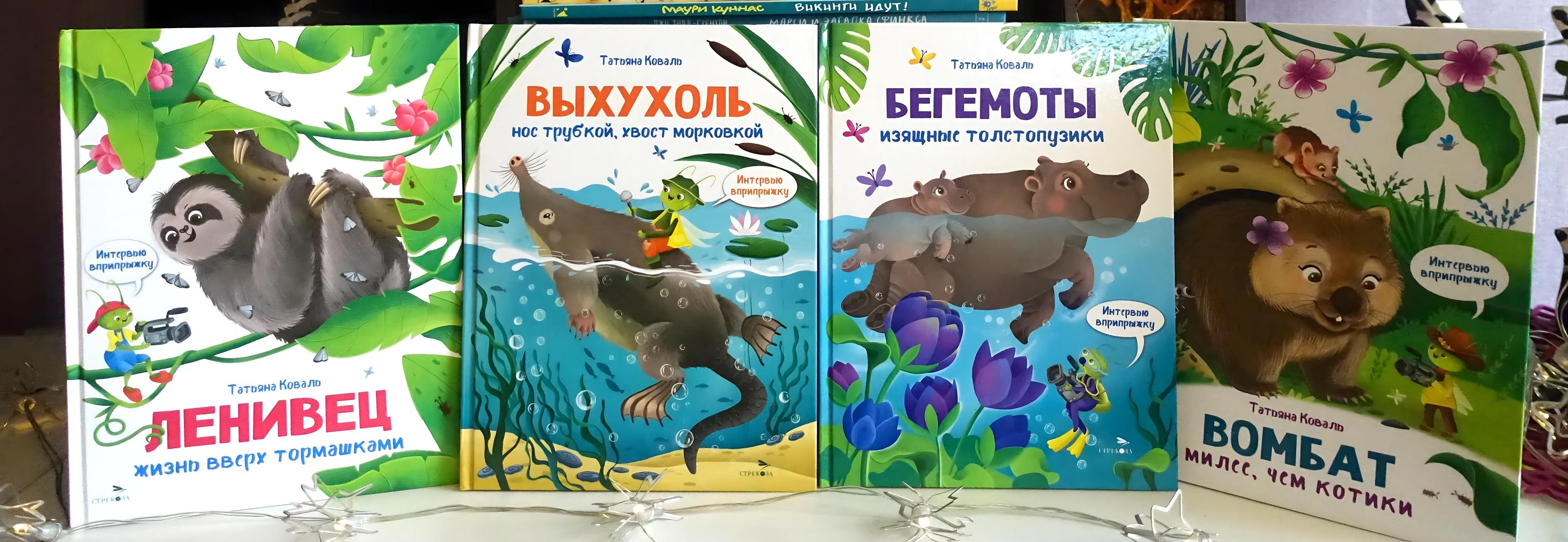 "Интервью вприпрыжку" - серия из 4 познавательных книг о животных, автор - Татьяна Коваль, издательство - Стрекоза. Кузнечик Пружинка берет интервью у Ленивца, Вомбата, Выхухоли и Бегемота. Подача материала - через диалоги в формате комикса. Достаточно высокая детализация разворотов, много животных, природы, насекомых, смешные ситуации.